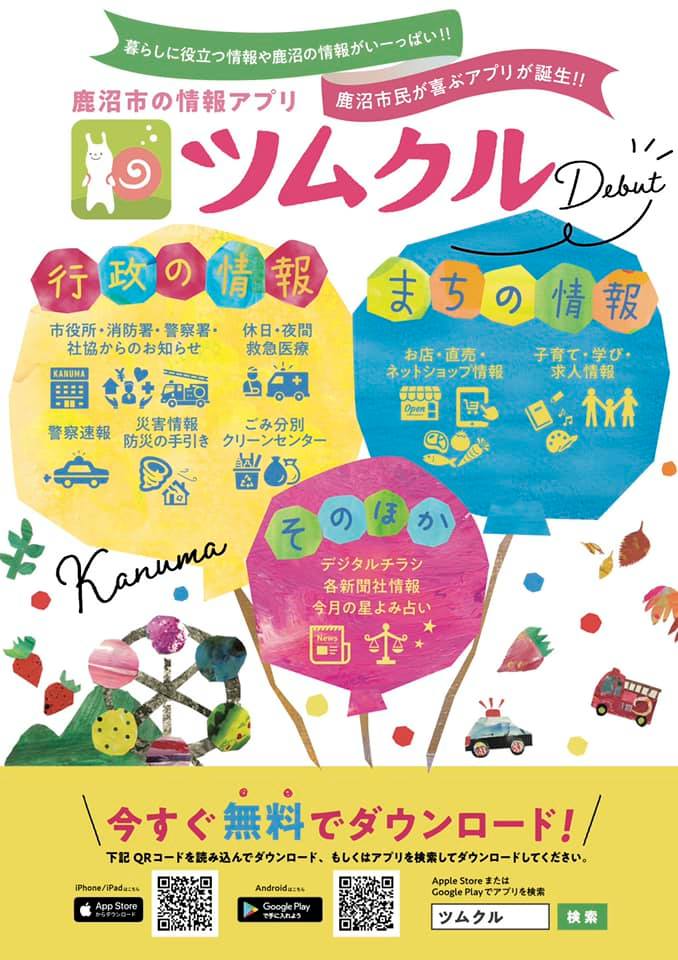 ツムクルは、栃木県鹿沼市の情報アプリです。 行政と人。お店と人。人と人。 ツムクルは、地域の中にあるたくさんの「つながり」を、 もっと身近に、もっと自然に届けてくれる“つなぐアプリ”です。 その名前には、 【ツクル・ツムグ・クル・サイクル】 という、まちの想いや情報がぐるりと循環しながら、 次の誰かにつながっていく、そんな願いが込められています。 それは瀬谷新聞店が大切にしていることをカタチにしました。 わたしたち瀬谷新聞店は、日々の新聞配達や地域活動を通じて、たくさんの方々と出会い、 言葉を交わしながら、鹿沼の“今”を肌で感じてきました。 「もっと気軽に、もっとタイムリーに、暮らしの情報を届けたい」 そんな想いから、「ツムクル」にも関わるようになりました。 行政のお知らせ、街のお店の情報、子育て支援、防災など、 暮らしに役立つ情報を 無料 で、どなたでも楽しめるアプリです。 新しい広告のカタチを、鹿沼から。 「伝えたい」を届ける。 「知りたい」が見つかる。 これまで新聞やチラシで行ってきた“地域の告知”も、 「ツムクル」ではスマホを通じて、より手軽に、 よりリアルタイムに発信できます。 若い世代からご年配の方まで、幅広い地域の方に届く、 新しい形の情報発信。 これからの鹿沼市のまちづくりにもつながっていくと感じています。  ̄ ̄ ̄ ̄ ̄ ̄ ̄ ̄ ̄ ̄ ̄ ̄ ̄ ̄ ̄ ̄ ̄ ̄ ̄ ̄ ̄ ̄ ̄ ̄ ̄ ̄ ̄ ̄ ̄ ̄ ̄ ̄ ̄ ̄ ̄ ̄ ̄ ̄ ̄ ■ 掲載をご希望の企業・お店の皆さまへ 「ツムクル」に掲載したい情報がある方は、お気軽に瀬谷新聞店までご連絡ください。 地域の魅力や想いを、アプリを通じて一緒に届けていきましょう! ※掲載には有料プランもございます。 【お問い合わせ先】 ㈱瀬谷新聞店 〒322-0021 栃木県鹿沼市下田町 TEL:0289-60-2855 FAX:0289-64-7255 MAIL:tsumukuru@seyashinbun.com 営業時間:9:00〜17:00(月〜土)  ̄ ̄ ̄ ̄ ̄ ̄ ̄ ̄ ̄ ̄ ̄ ̄ ̄ ̄ ̄ ̄ ̄ ̄ ̄ ̄ ̄ ̄ ̄ ̄ ̄ ̄ ̄ ̄ ̄ ̄ ̄ ̄ ̄ ̄ ̄ ̄ ̄ ̄ ̄ 鹿沼の「今」が、手のひらに。 アプリ「ツムクル」、ぜひ体験してみてください!