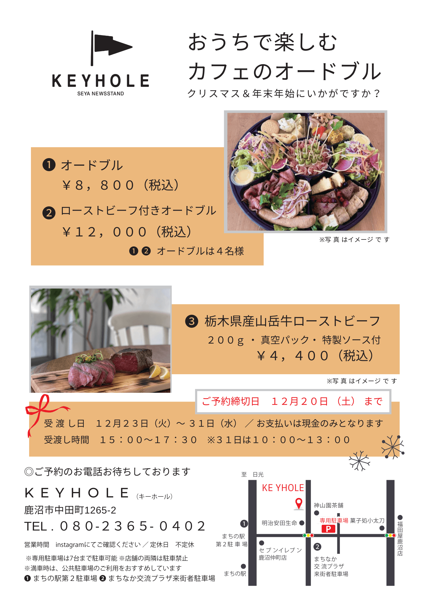季節の素材をふんだんに使い、丁寧に仕上げられた一皿は、 食卓をやさしく華やげてくれます。 クリスマス・年末年始の集まりにもぴったりです。 ■ 内容・価格(4名様) ①オードブル ¥8,800(税込) ②ローストビーフ付きオードブル ¥12,000(税込) ③栃木産山岳牛ローストビーフ 200g ¥4,400(税込) ■ 受け渡し日 12月23日(火)~12月31日(水) ■ 受渡し時間 15:00~17:30 ※31日は10:00~13:00 ■ 予約方法 ご予約は KEYHOLE までお願いいたします。 (電話番号・instagram・店頭など)↑KEYHOLEのinstagramはこちらから